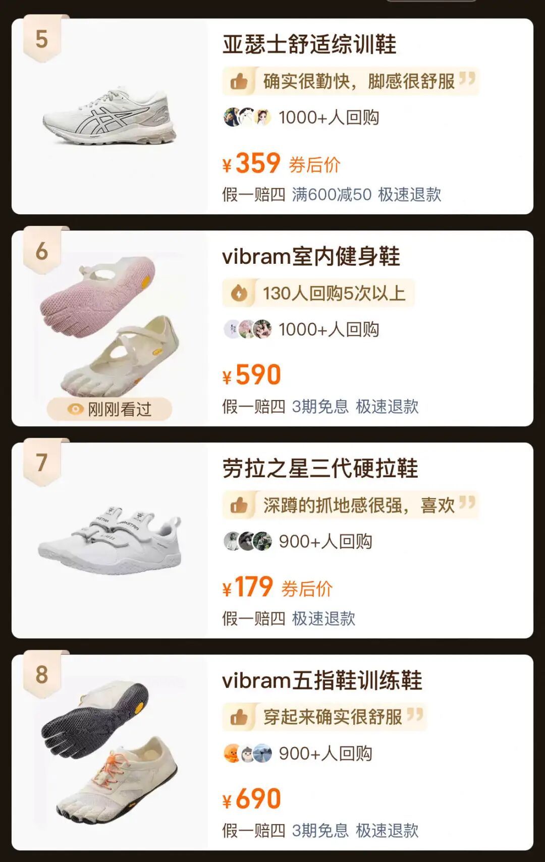 在天猫综合训练鞋回购榜单前10名中,Vibram是唯一占据两个名额的品牌