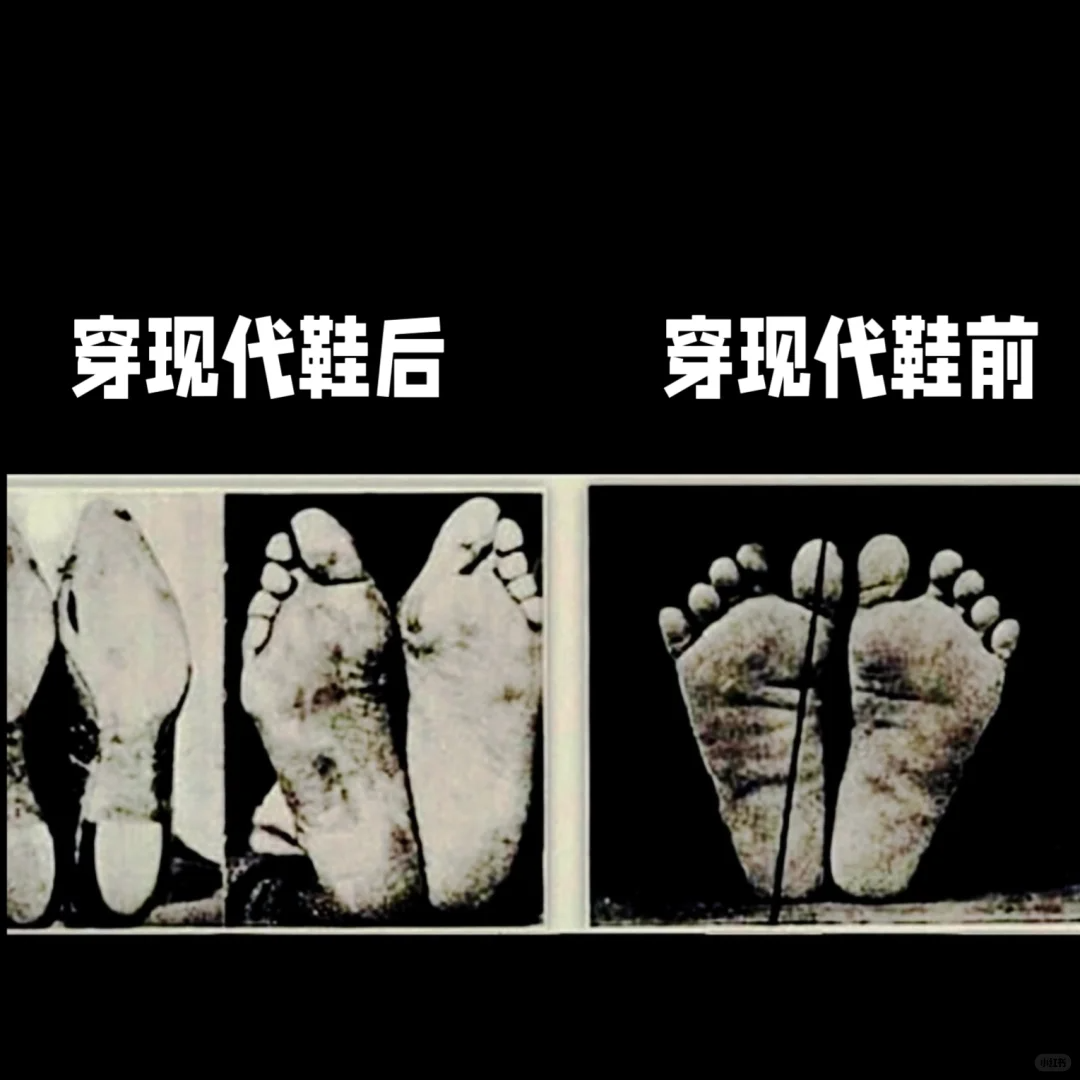 在自然站立的状态下,人体的脚趾会因为受力而张开,脚掌形态与未受规训的婴儿十分相似。但如果经过日积月累的窄鞋束缚,脚部就会被迫适应鞋子的形状,引发拇外翻、甲沟炎等疾病。